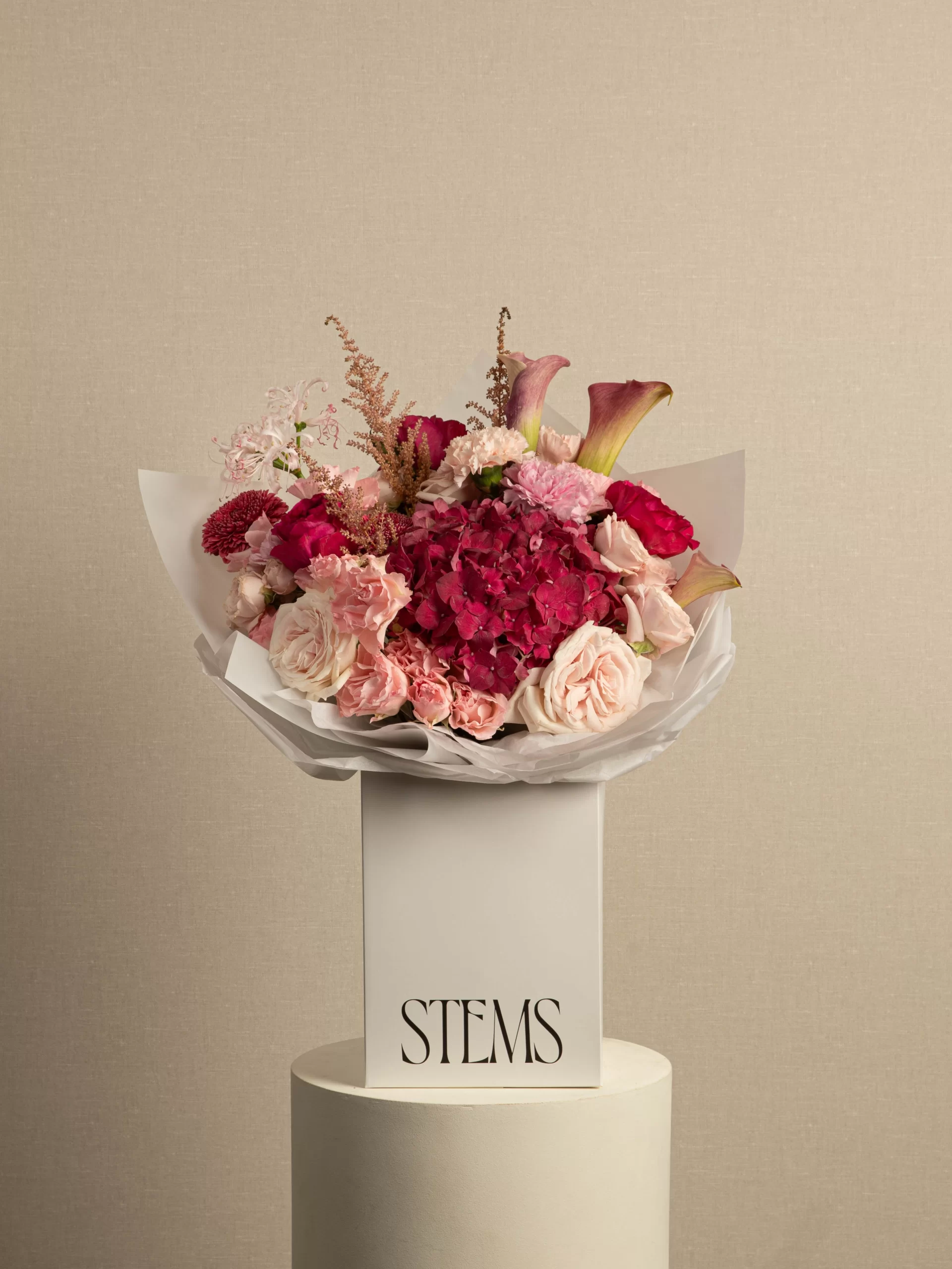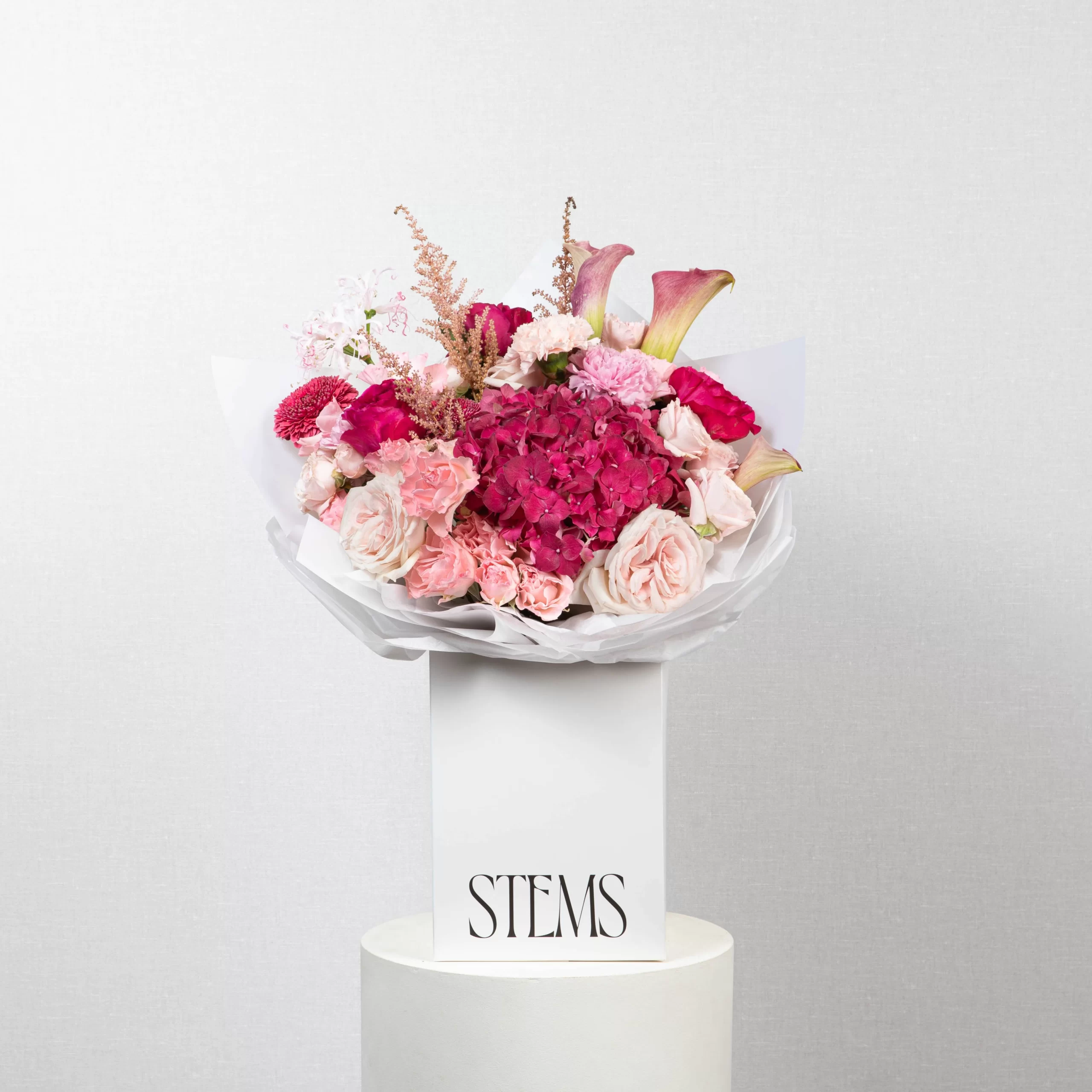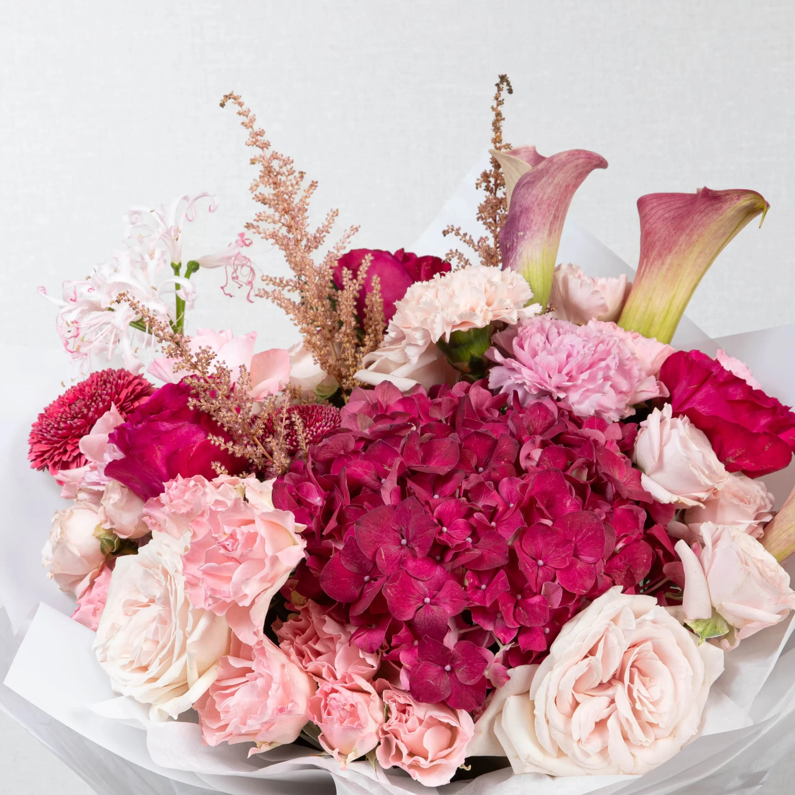 Featuring lush hydrangea and scented garden roses, this arrangement instantly lifts the mood with its playful and radiant hues.