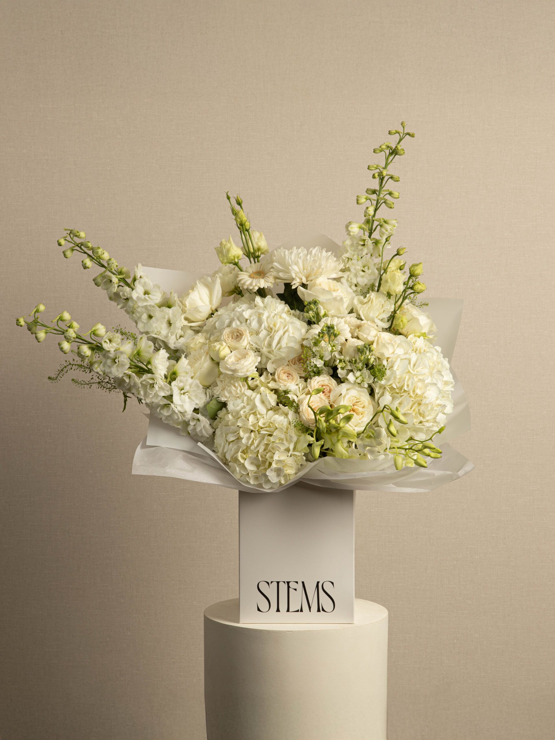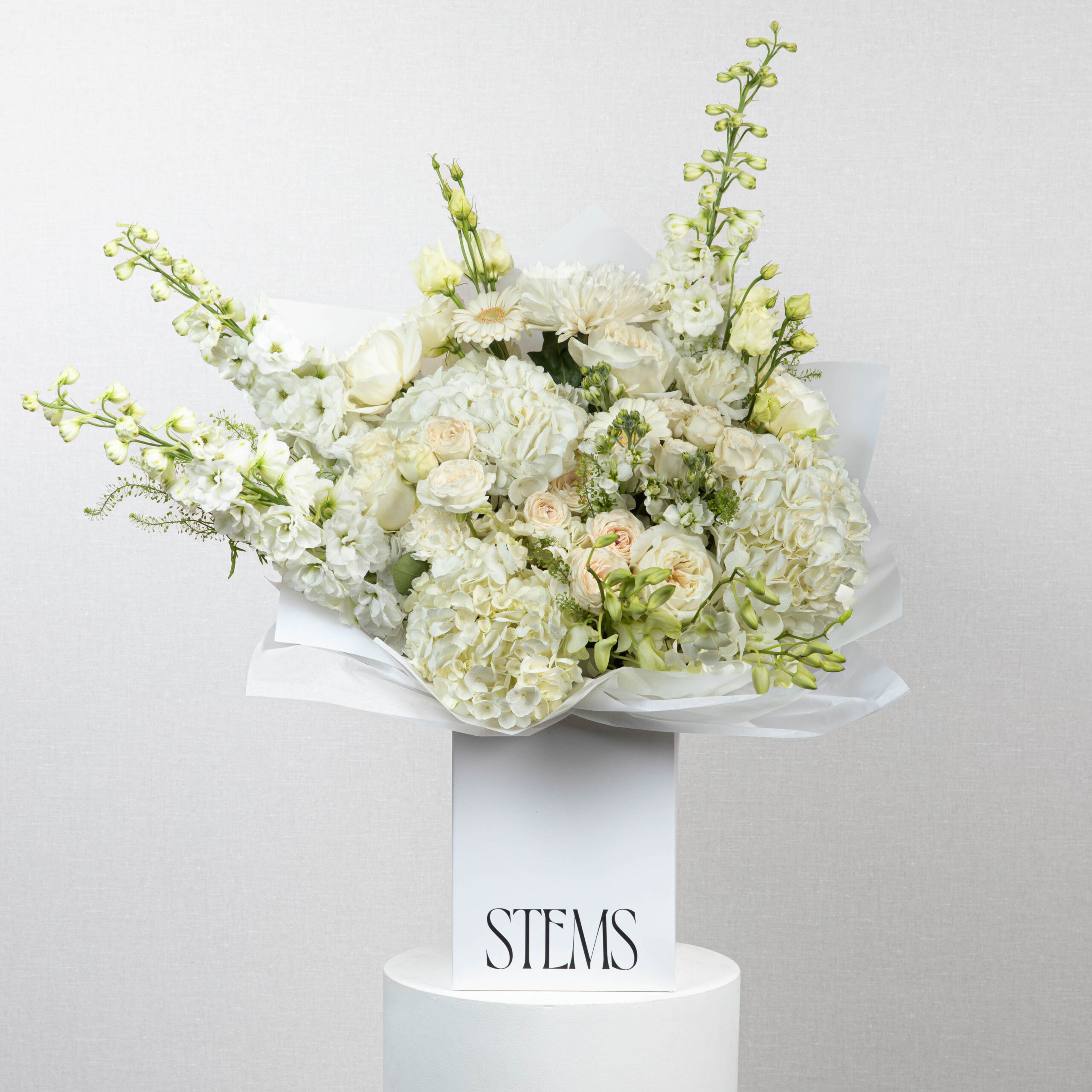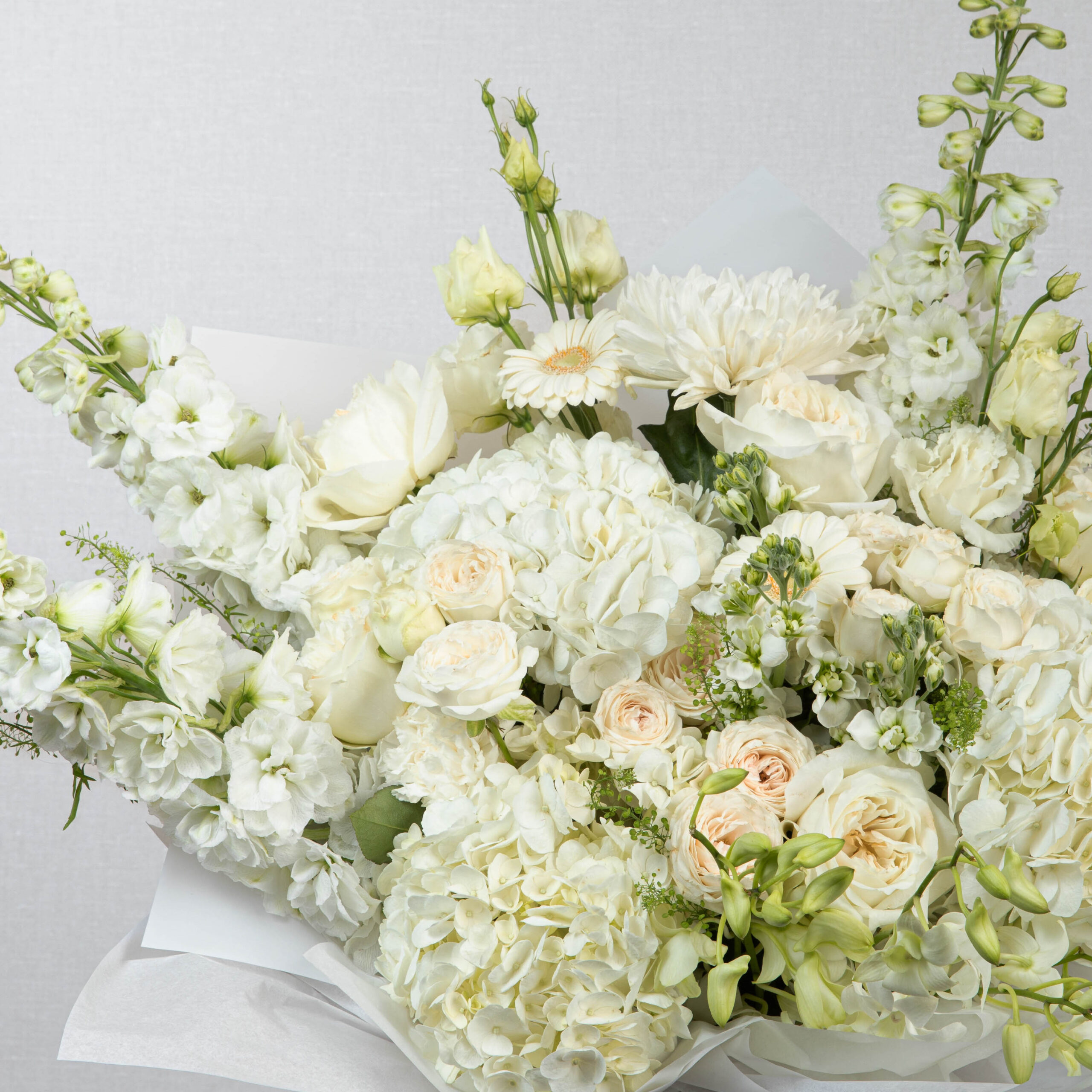 Elegant and serene — featuring soft hydrangeas, roses, and delphiniums in creamy ivory tones, creating a timeless bouquet that exudes calm and grace.